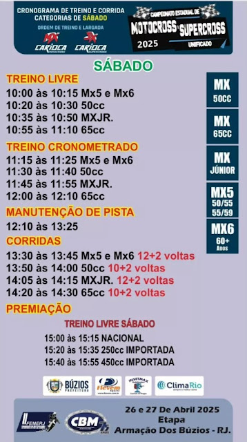 Búzios será mais uma vez palco do Campeonato Carioca Unificado de Motocross e Supercross, nos dias 26 e 27 de abril, na Fazenda Cunha Bueno, localizada no bairro de José Gonçalves. O evento marca a grande final da temporada 2024 e a Abertura Oficial da temporada 2025.