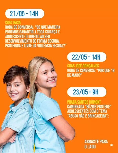 Em alusão ao Maio Laranja, a Prefeitura de Búzios, por meio da Secretaria de Desenvolvimento Social, Trabalho e Renda, promove uma série de atividades para conscientizar a população sobre a importância da proteção dos direitos de crianças e adolescentes. A ação será realizada através da Coordenadoria da Criança e Adolescente.
